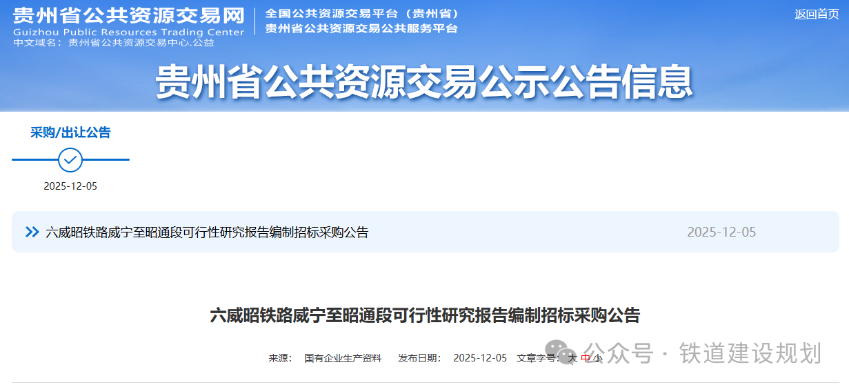 2025/12/0812月5日,六威昭鐵路威寧至昭通段可行性研究報(bào)告編制招標(biāo)采購(gòu)公告在貴州省公共資源交易網(wǎng)發(fā)布,招標(biāo)人為貴州鐵路投資集團(tuán)有限責(zé)任公司。根據(jù)公告:六威昭鐵路項(xiàng)目位于貴州省六盤水市、畢節(jié)市、云南省昭通市,線路自貴...